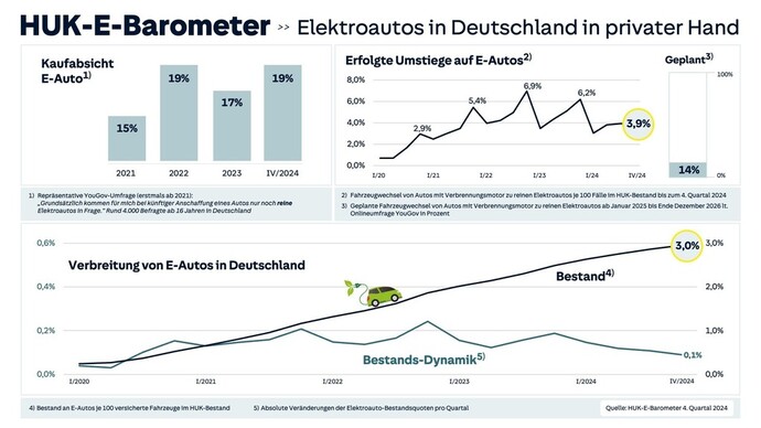 Besonders geringe Fahrerfahrung mit E-Autos haben Ältere, Wenig-Fahrer und Frauen. Das ist eine der Erklärungen, die das aktuelle HUK-E-Barometers für die langsame Entwicklung bei der Umstellung auf Elektromobilität liefert. Die Studie des Versicherungsunternehmens stellt fest, dass private Halter bei Fahrzeugwechsel im vergangenen Jahr so selten von Verbrennern auf reine Elektroantriebe umgestiegen wie zuletzt vor drei Jahren. 2024 stiegen nur vier von 100 Fahrzeugkäufern auf ein Elektroauto um. Das vierte Quartal 2024 erreichte bei Umstiegen sogar den schlechtesten Jahresend-Quartalswert seit 2020.